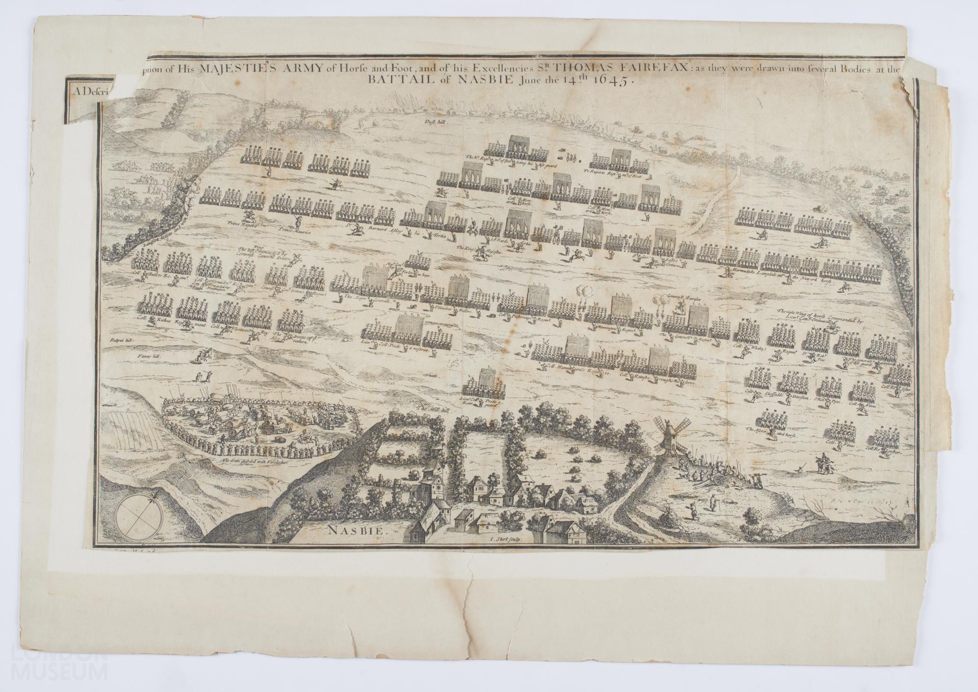 A Description of His Majestie's Army of Horse and Foot, and of his Excellencies Sr. Thomas Fairefax: as they were drawn into several Bodies at the Battail of Nasbie June teh 14th 1645. This engraving appears to have been removed from a copy of Joshua Sprigge's Anglia Rediviva which covers the campaigns of the New Model Army from its raising to the fall of Oxford. The volume was published by John Partridge in 1647 with engravings by John Sturt. Although stylized the plan of the Naseby battlefield is very accurate and has been discussed by Glen Foard, in his book Naseby, published in 1995. The National Army Museum has a first edition copy of Anglia Rediviva with accompanying plan.
