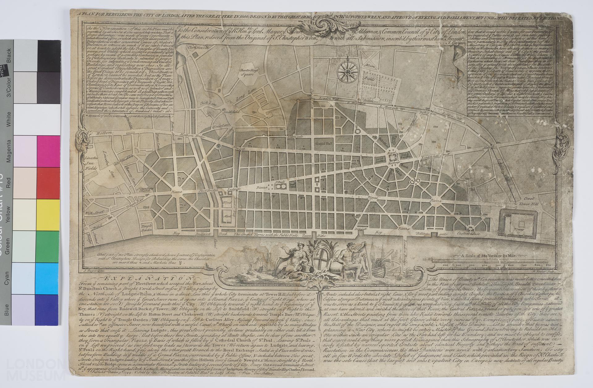 - A plan for rebuilding the City of London after the Great Fire in 1666; design'd by that great architect Sr Christopher Wren; and approv'e of by King and Parliament; but unhappily defeated by factions
