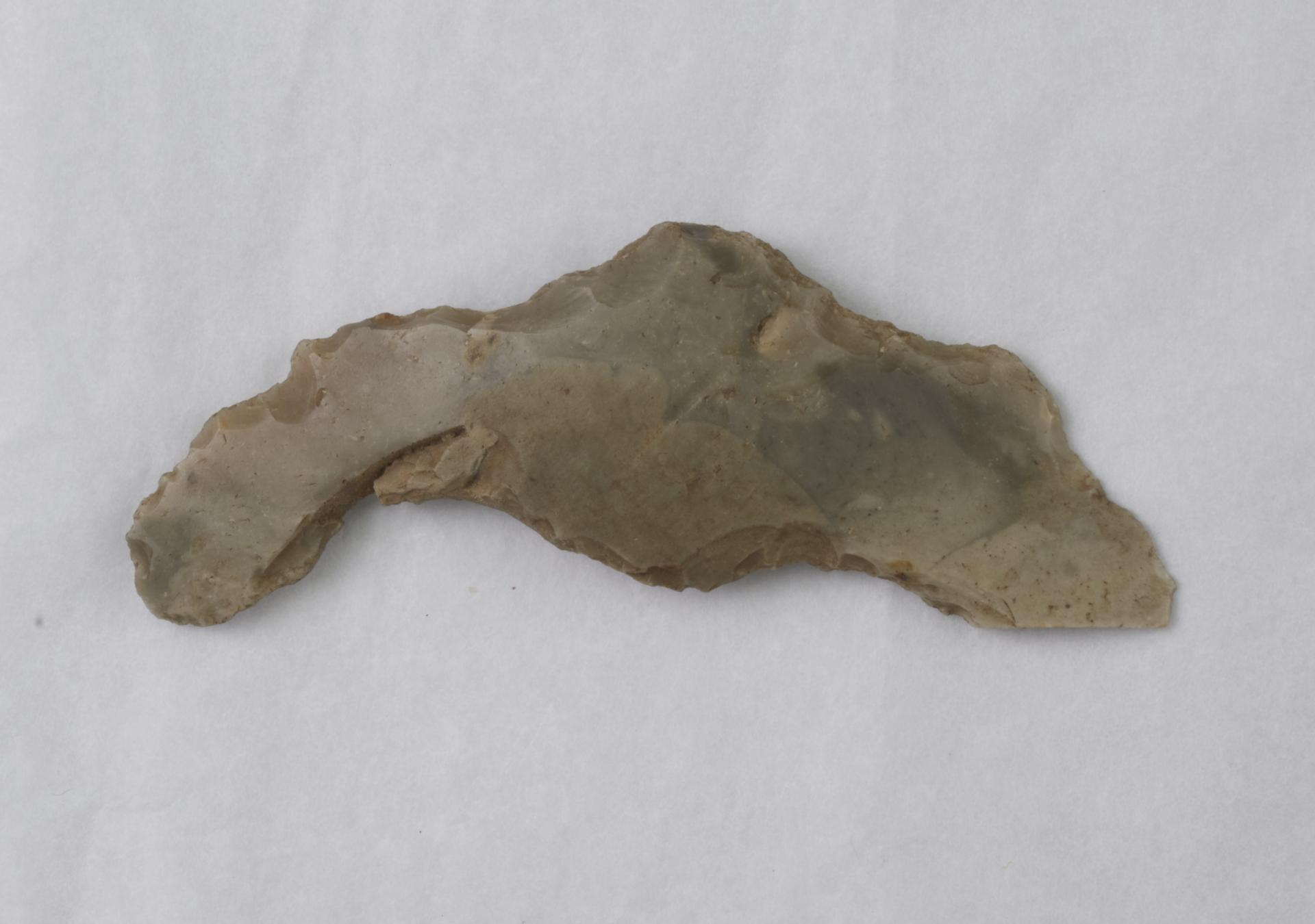Side scraper of grey flint with much wear on convex edge and retouch on concave edge. Roughly crescent shaped.