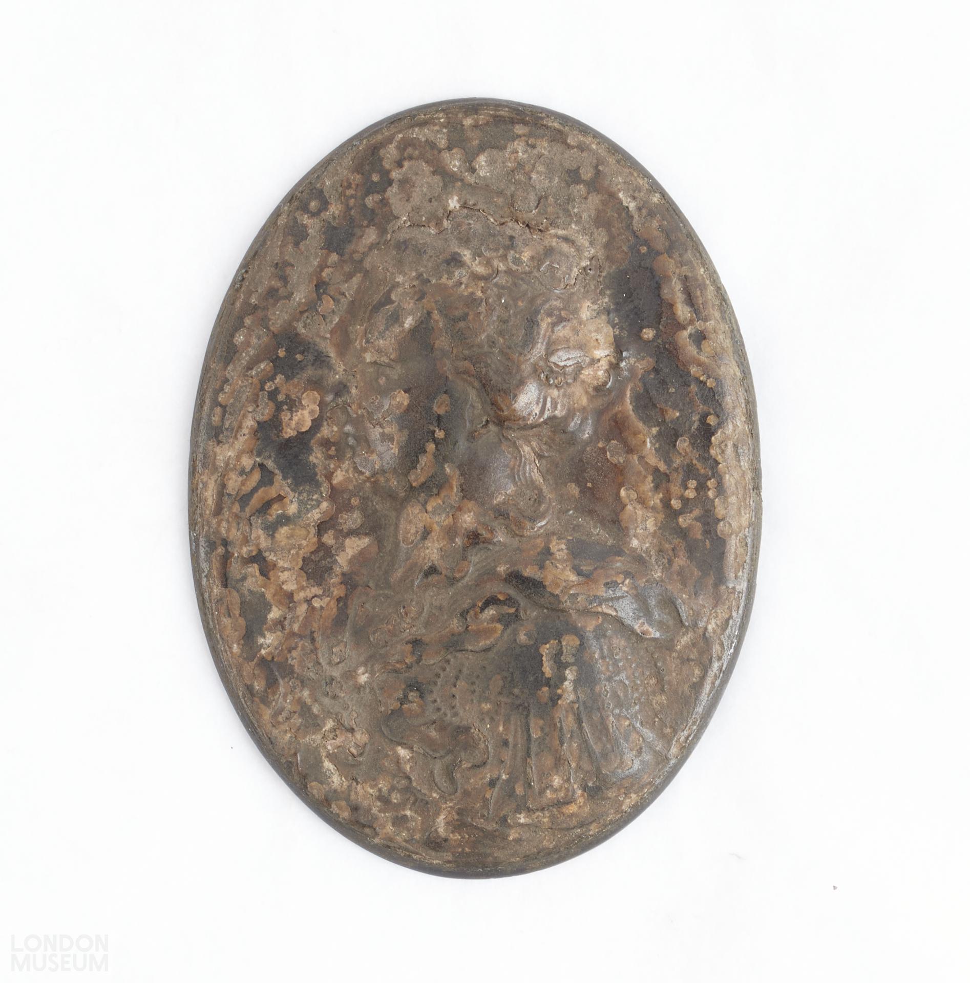 Miniature portrait, oval, depicting female bust. Heavily weathered and stained with parts flaking off.