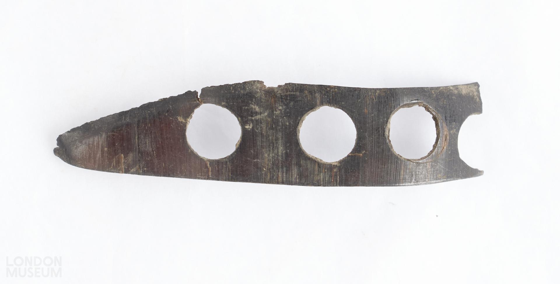 Strip of bonen waste with three circular cut-outs. Small crack in one hole.