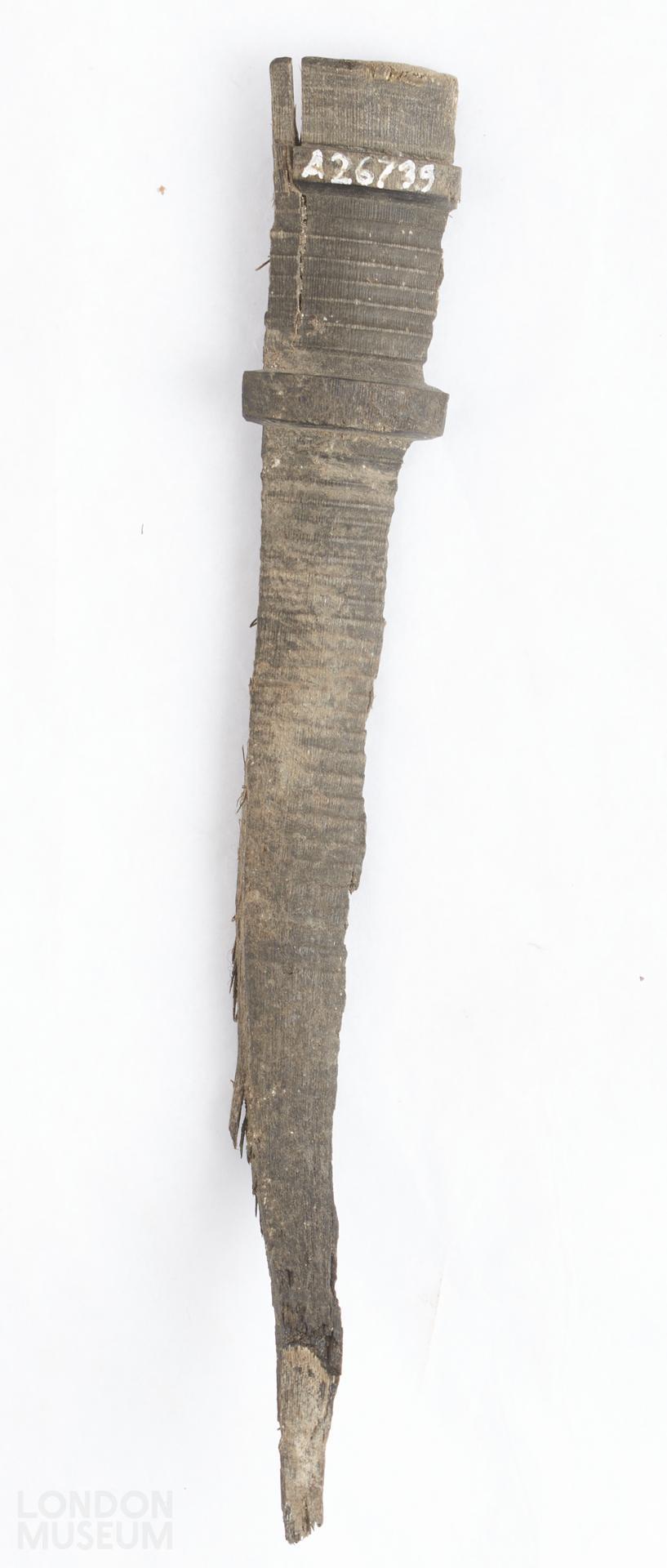 Powder horn fragment. Grooved pattern along horn fragment. Two metal rectangular bars cross the fragment horizontially. Stained and weathered.