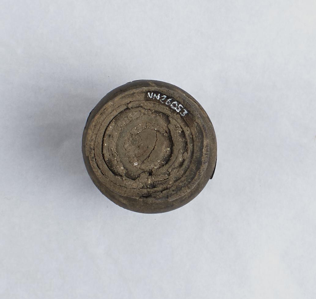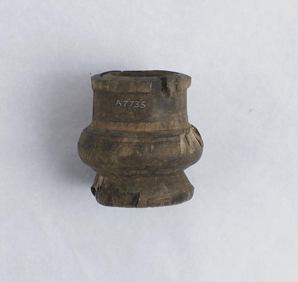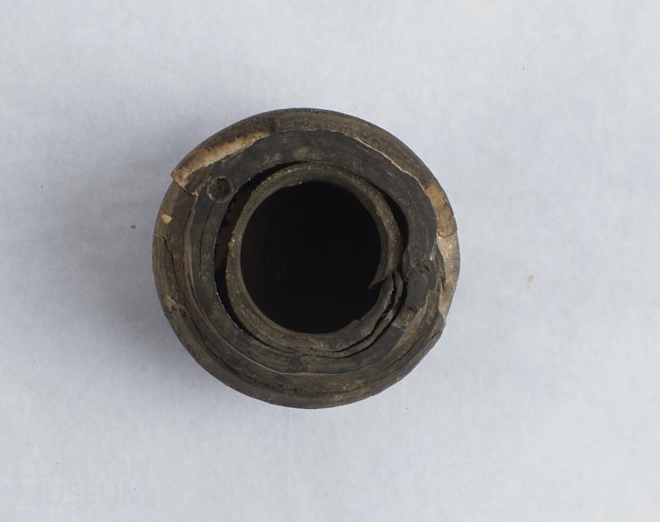 Inkwell made from horn, with two holes at rim. Badly chipped with parts missing.