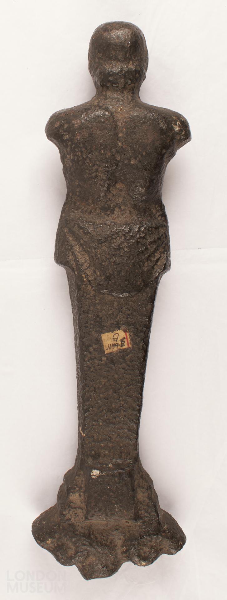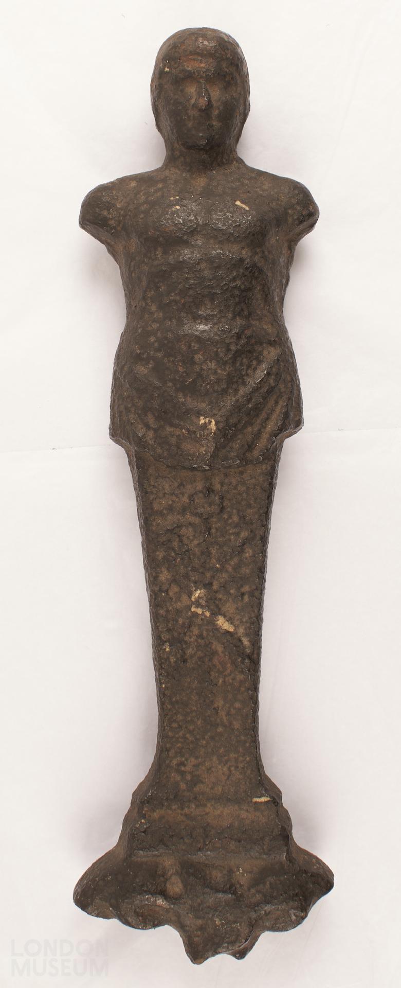 The front of a fire dog in the form of a cast iron male figurine without arms. Iron is pitted and corroded.