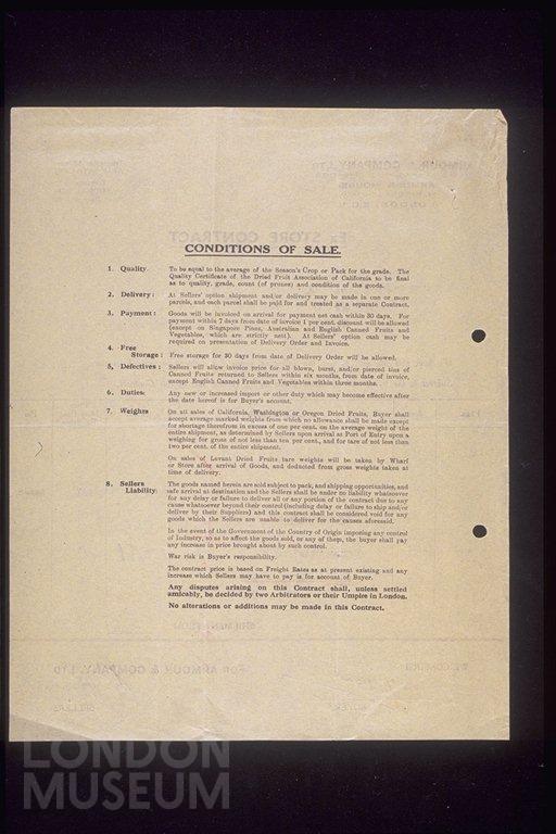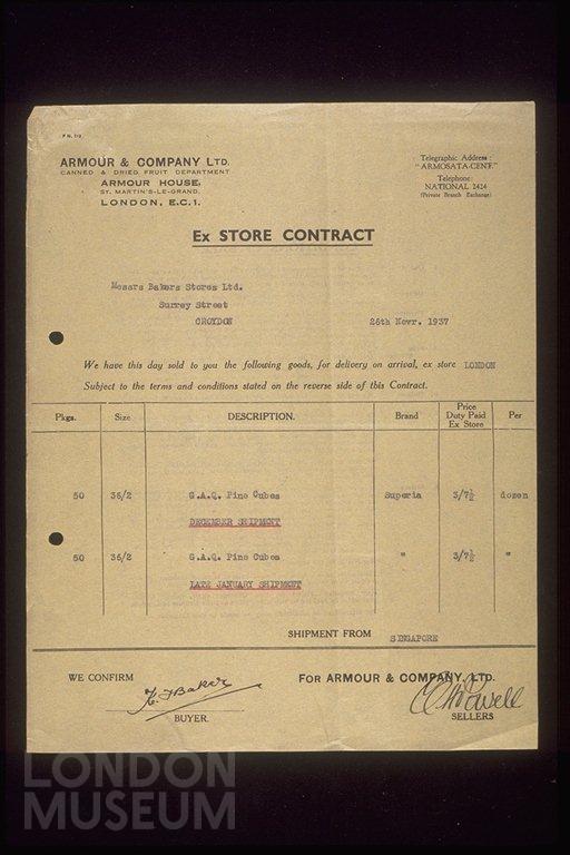 Receipt issued by Armour and Company Limited, sellers of canned and dried fruit, billhead with address and telephone. Goods sold to Messrs Bakers Stores Limited, 26 November 1937, conditions of sale listed on reverse.