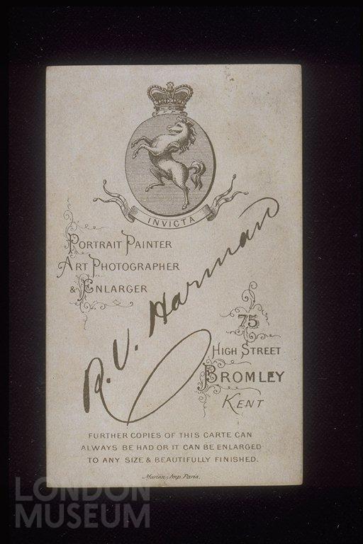 Trade card of R.V. Harman, portrait painter and photographer, showing address and illustration of horse. On reverse there is an article from The Advertiser but it makes no reference to R.V. Harman.