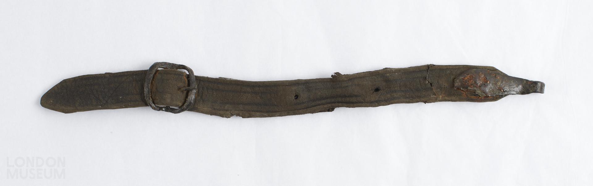Leather strap with buckle and metal loop on one end. Decorated with linear patterns.