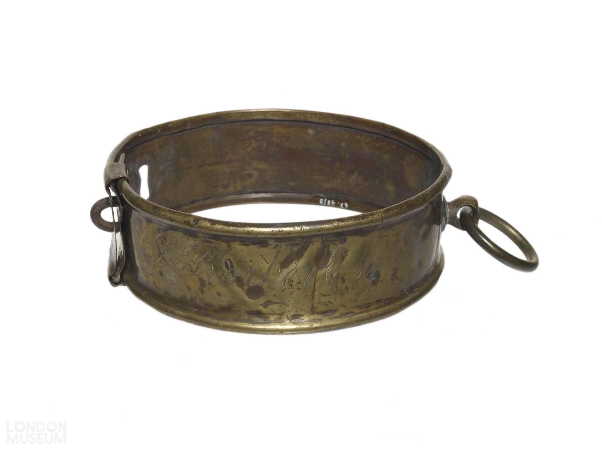 Brass dog collars at this time primarily served as a means of identifying property. When marked or engraved with the dog owner’s name, the collar became the object that gave proof of ownership. The collar has three eyelet holes, and would have been fixed closed with a padlock to which the owner had the key. It also has a ring, which would have been used to chain the dog or attach the collar to a leash.
