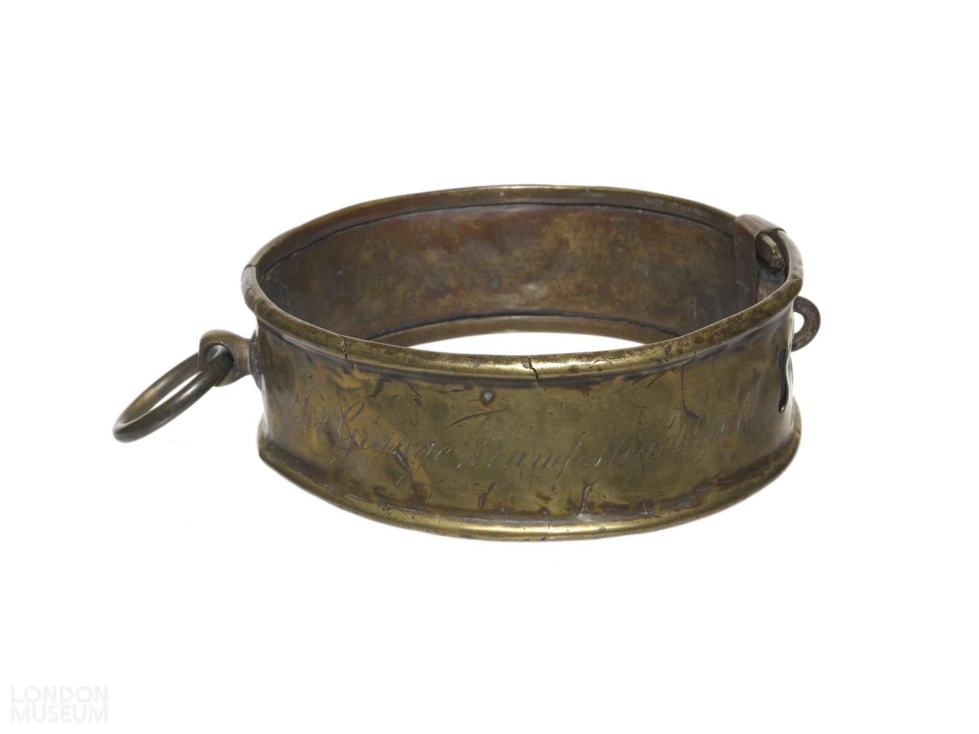 Brass dog collar inscribed 'Francis Barber Esq, The Grange, Hampstead Heath'.