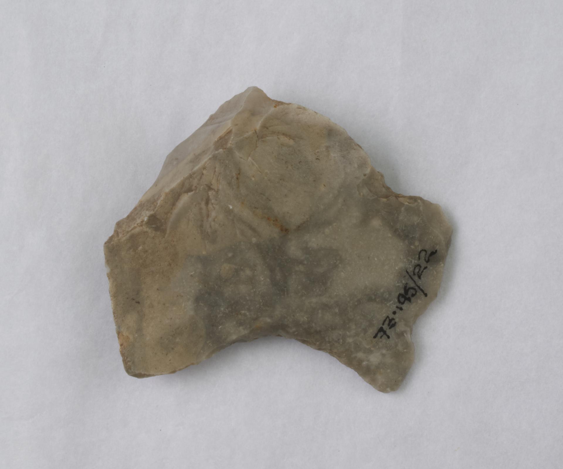Flint hollow scraper/spokeshave. Light grey in colour.