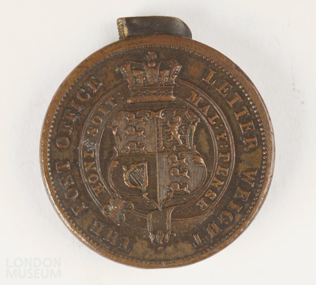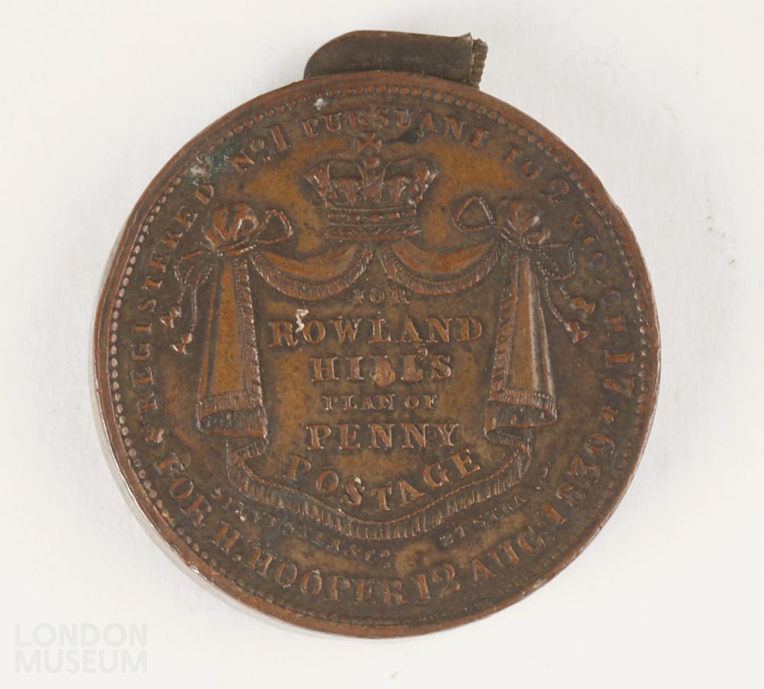 Copper Post Office letter weight, August 1839. One side is decorated with a coat of arms and has the inscription 'The Post Office Letter Weight'. The other side is inscribed 'For Rowland Hills / Plan of Penny Postage' in the centre, and the edge is inscribed 'For H. Hooper / the 12th August 1839 / Registered Number 1 Persuant to 2 Vic. CH 17'.