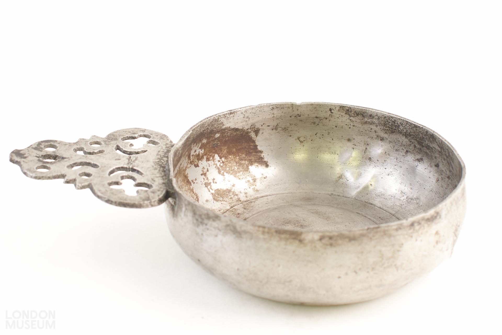 A porringer with a single ear of trefoil form and geometric piercing. The central boss in the base of the bouged bowl is accentuated by turned concentric circles. There is a touch mark underneath the ear of a fleur-de-lys surrounded by the legend ‘ASH & HUTTON’ for the partnership of Ash & Hutton, Bristol OP118. Gregory Ash, OP117, who was free in Bristol in 1741 and William Hutton, OP2495, who was free in Bristol in 1739 joined forces in the 1760s. Hutton died in 1768. Date: c.1760-68