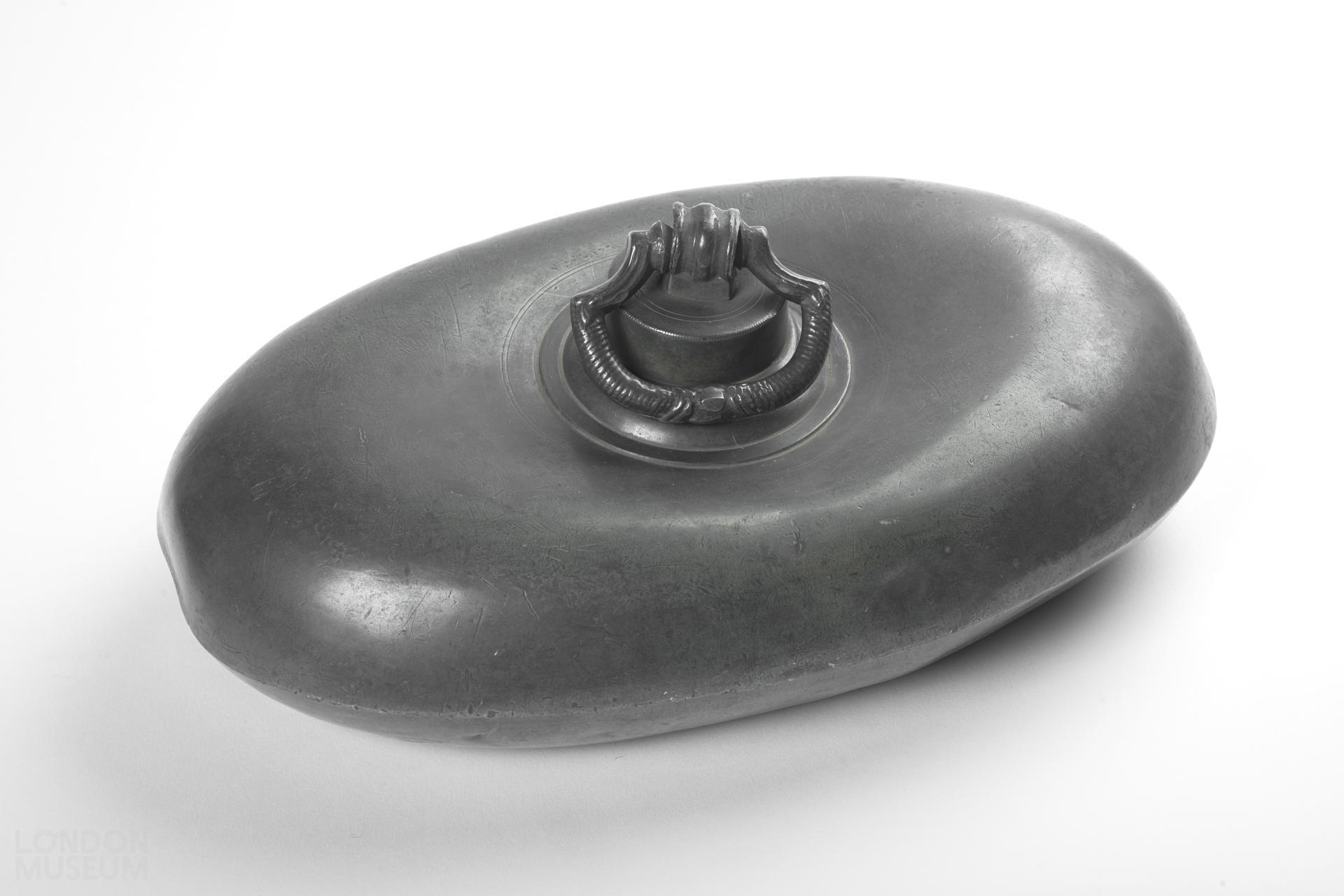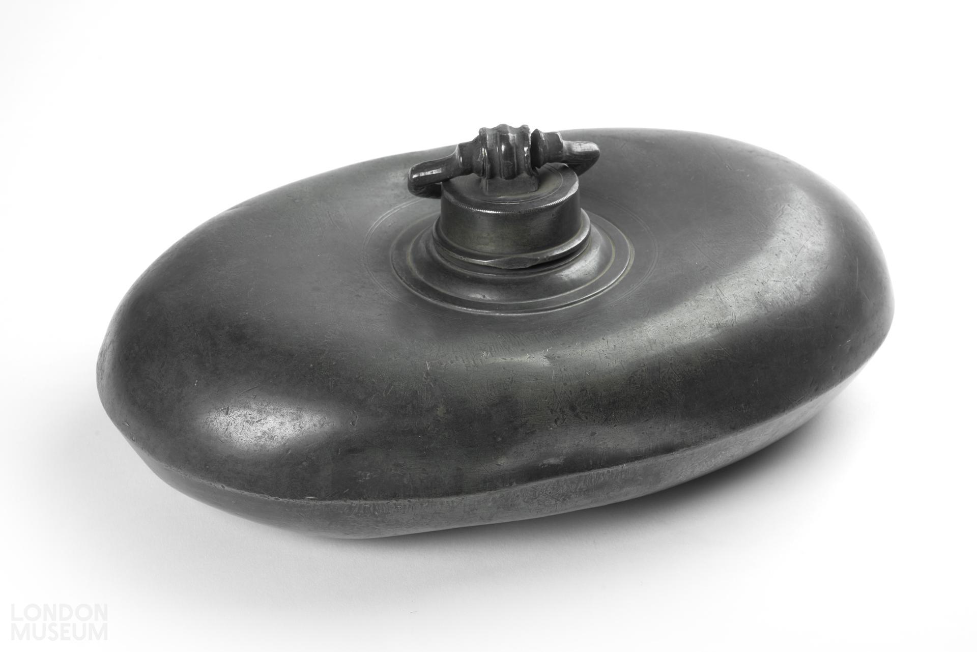 A hot water bottle or bed warmer of squat oval shape with a straight-sided, screw top, internal sealing cap and scallop-shaped hanging ring. Unmarked, but probably south German or Austrian. Date: late 18th or early 19th century.
