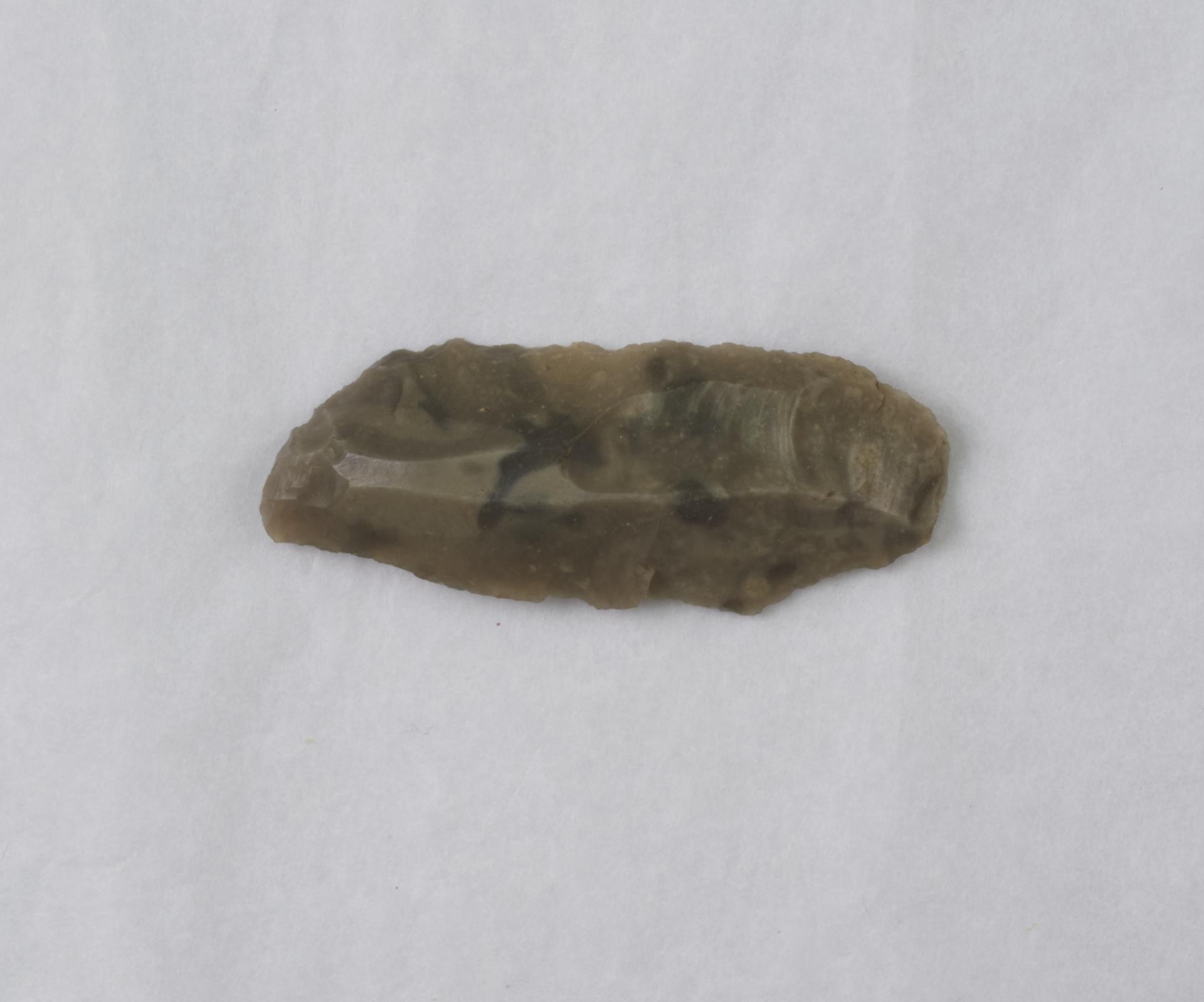 End and side scraper made on a blade. Roughly rectangular shaped. Smooth on one side.