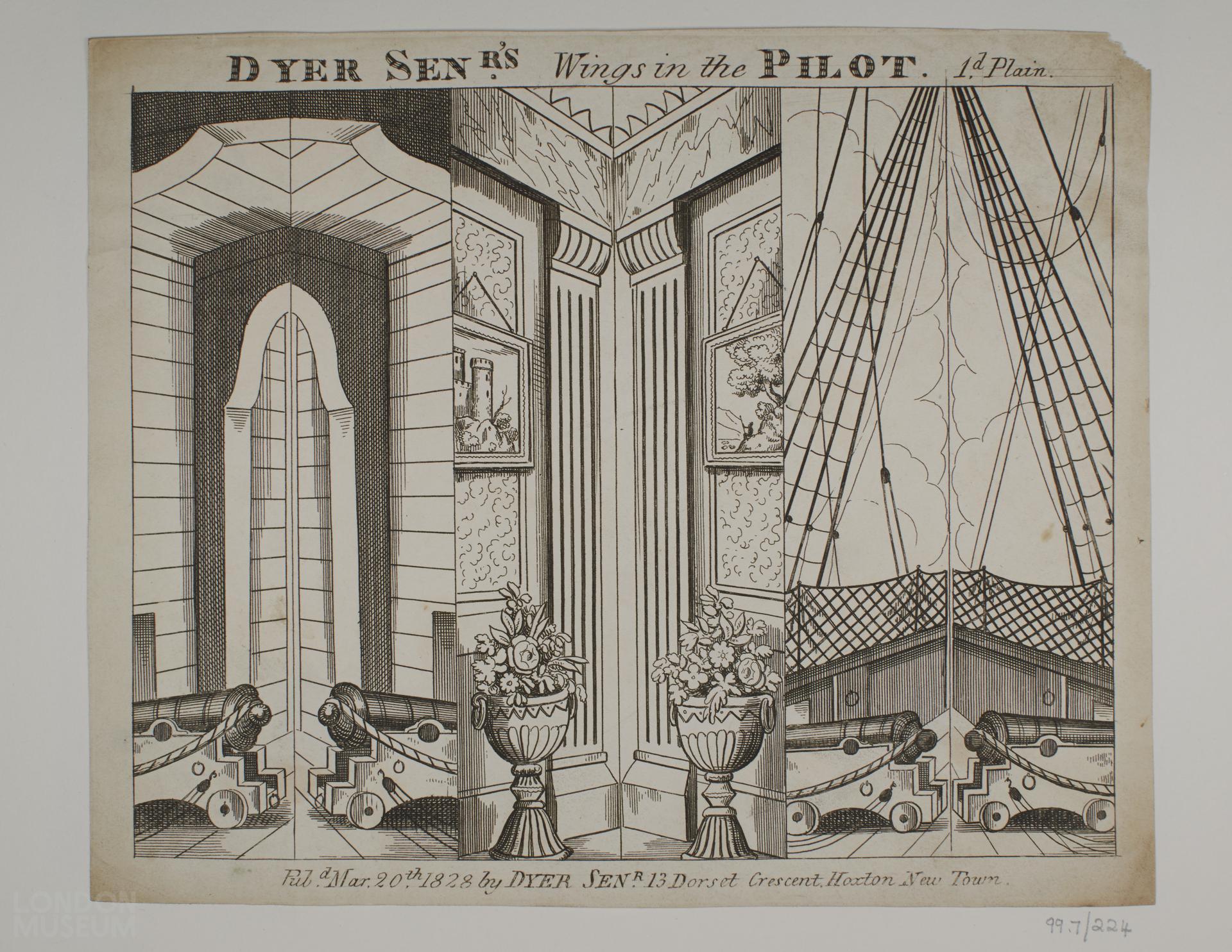 Toy theatre scenery sheet relating to the play 'Pilot'. Published by Dyer Senior, 13 Dorset Crescent, Hoxton New Town, London. Published march 20th 1828.