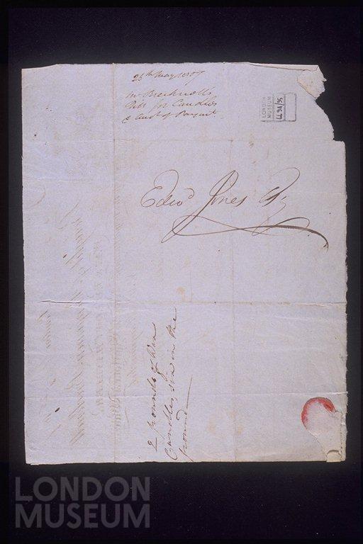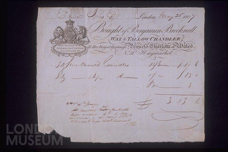 Copper-engraved billhead and handwritten invoice issued by the wax and tallow chandler Benjamin Brecknell, located at 31 Haymarket. The billhead includes an engraving of the Royal Coat of Arms referring to the chandler's role as a supplier to Princess Charlotte of Wales. A small vignette below the Arms notes that the chandler supplies 'fine sealing wax, spermaceti candles, flambeaux etc'. The invoice dated May 26th 1807 refers to the supply of mould candles to Edward Jones.Tallow chandlers were the cheapest form of domestic candle. With the greater availability of spermaceti candles from the late 18th century the use of tallow candles declined. Spermaceti candles were brighter than tallow and did not smell so repugnant.