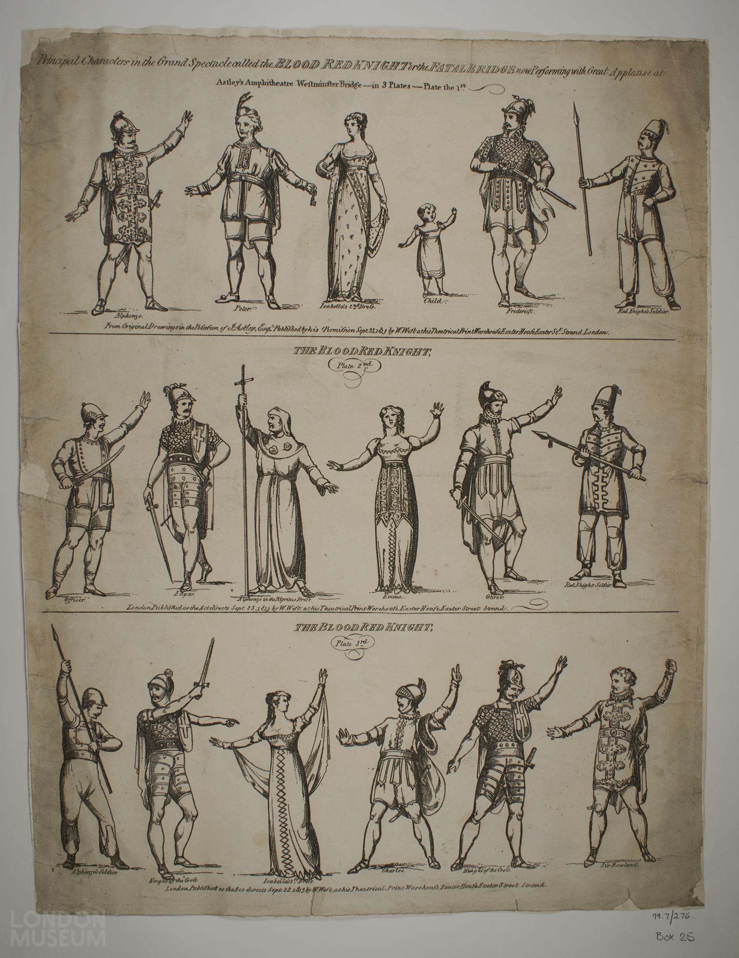 Single large uncut toy theatre sheet for 'The Blood Red Knight or the Fatal Bridge'. Comprising 3 uncoloured character plates numbered 1-3 which would have been cut and sold individually. Each with publishers details and date Sept 23 1813. Plate one marked 'Principal characters in the Grand Spectacle called the Blood Red Knight or the Fatal Bridge now performing with great applause at Astley's Amphitheatre, Westminster Bridge in 3 plates' 'From original drawings in the possession of J. Astley Esq. published by his permission'.