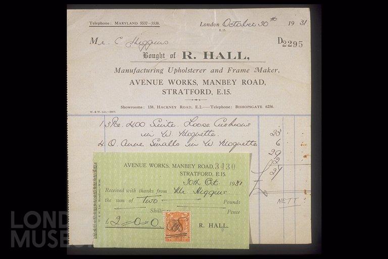 Invoice from R. Hall, manufacturing upholsterer and frame maker.