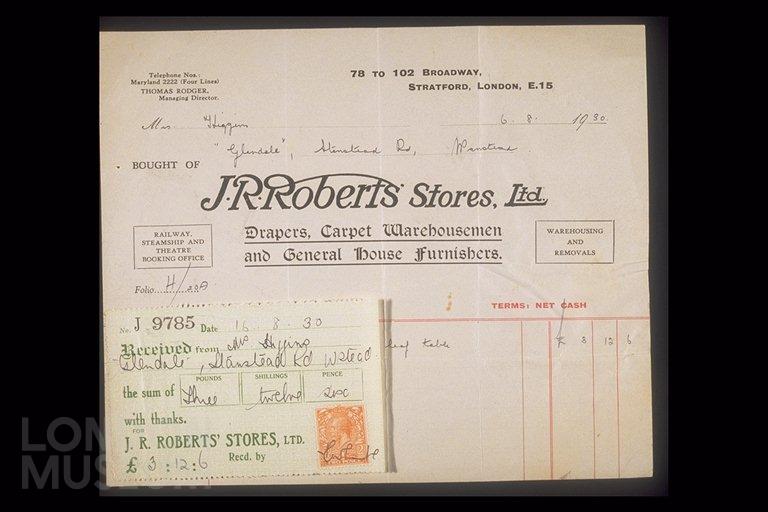 Invoice from J.R. Roberts Stores Ltd, drapers, carpet warehousemen and general house furnishers.