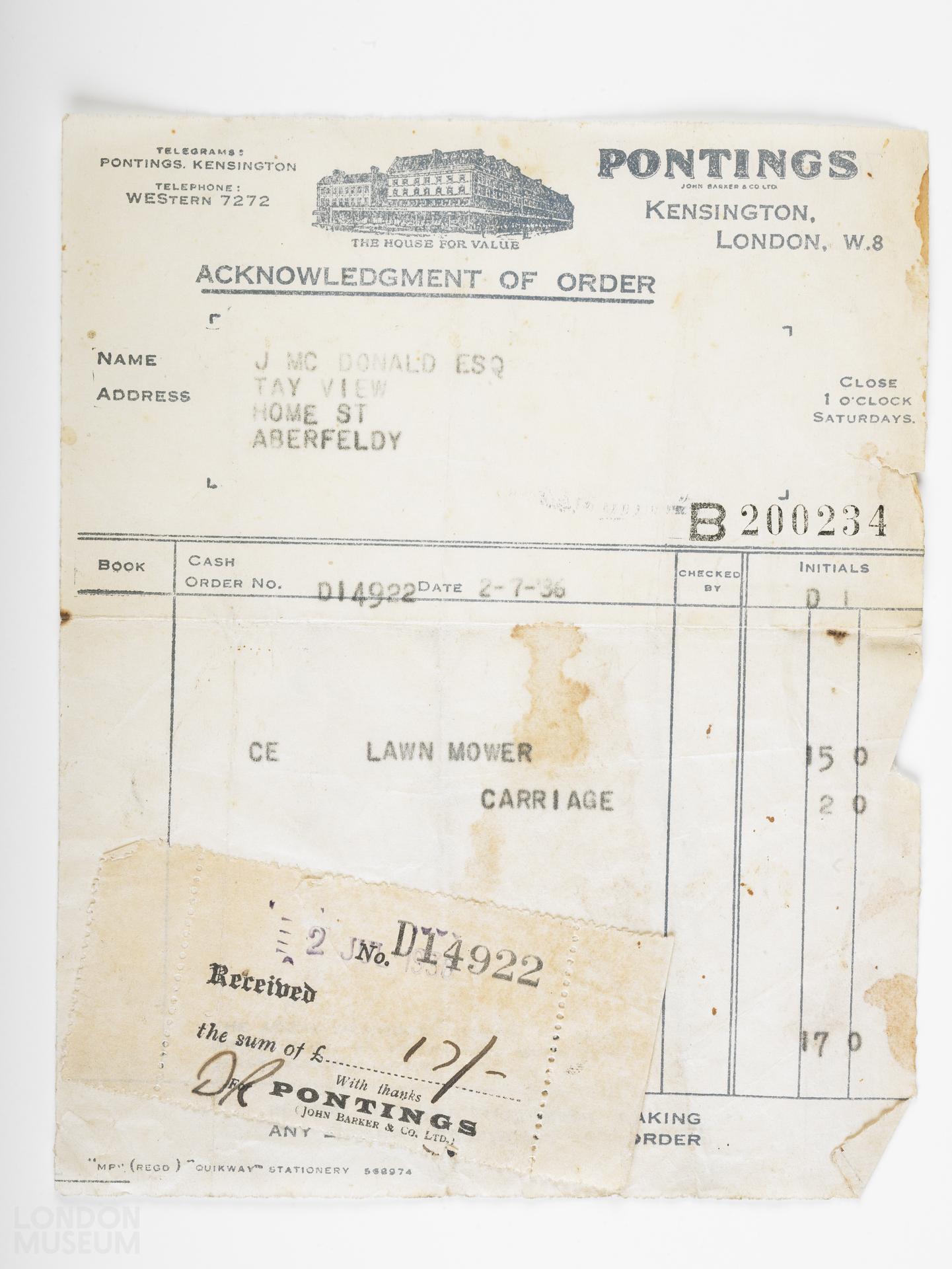 Invoice from Pontings, numbered D14922 to J. McDonald, for lawn mower carriage.