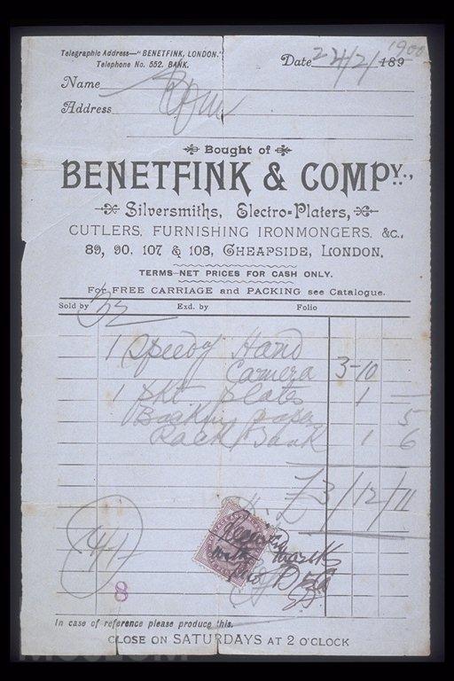 Stamped invoice from Benetfink and Compy, cutlers, siversmiths and furnishing ironmongers.