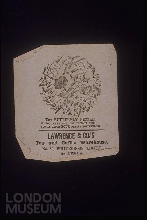 Wood-engraved paper sheet used for wrapping small quantities of loose tea and coffee purchased from Lawrence and company's tea and coffee warehouse located at 89 Whitecross Street . The sheet is engraved with the name and address of the merchant and an optical puzzle entitled 'The Butterfly puzzle if you make good use of your eyes you'll catch four pretty butterflies' As well as publicising the business marketing incentives such as the incorporation of puzzles and games in wrapping papers were employed to promote sales and encourage customer loyalty.