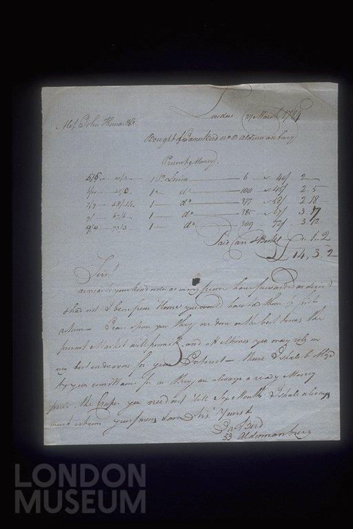 Handwritten invoice issued by the linen draper James Bird located at 53 Aldermanbury. Dated 27th March 1784 the invoice written in English round hand script refers to the supply of linen to the drapery firm of John Thomas and Company based in Hinckley, Leicestershire. Similarly to other county drapers this firm ordered cloth from London wholesalers, who liaised directly with the cotton and woollen manufacturers on their behalf. James Bird has added a handwritten note to the bottom of the invoice with information about the order and payment.