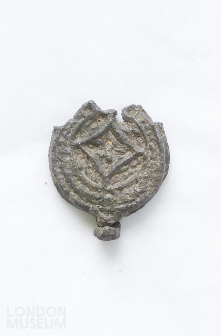 Circular pendant seal. Features a cruciform/ diamond design on both sides. Metal is heavily weathered and any other immages or text is illegible. There is a small open hook at the top of the pendant. The bottom part has broken off. Metal is pitted and corroded.