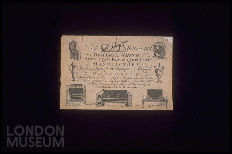 Engraved trade card publicising the ironmongery business of Bowley & Smith located at 57 Holborn Hill. The trade card is engraved with illustrations of goods supplied by the firm including kitchen stoves and fire grates and notes that they undertake general blacksmithing work. The trade card also includes the trade sign of a dog licking from a three legged cooking pot traditionally associated with ironmongers. In 1823 a young Charles Dickens, noticed the sign of a 'Dog's Head in a Pot' over a corner shop in Blackfriars Road whilst walking home to Lant Street, Southwark. He noted in a letter 'the likeness of a golden dog licking a golden pot over a shop door.'