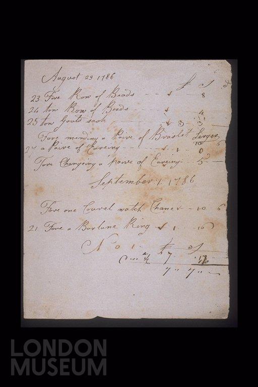 Handwritten invoice for haberdashery items such as beading and sashes, dated 29th of August, 1786.