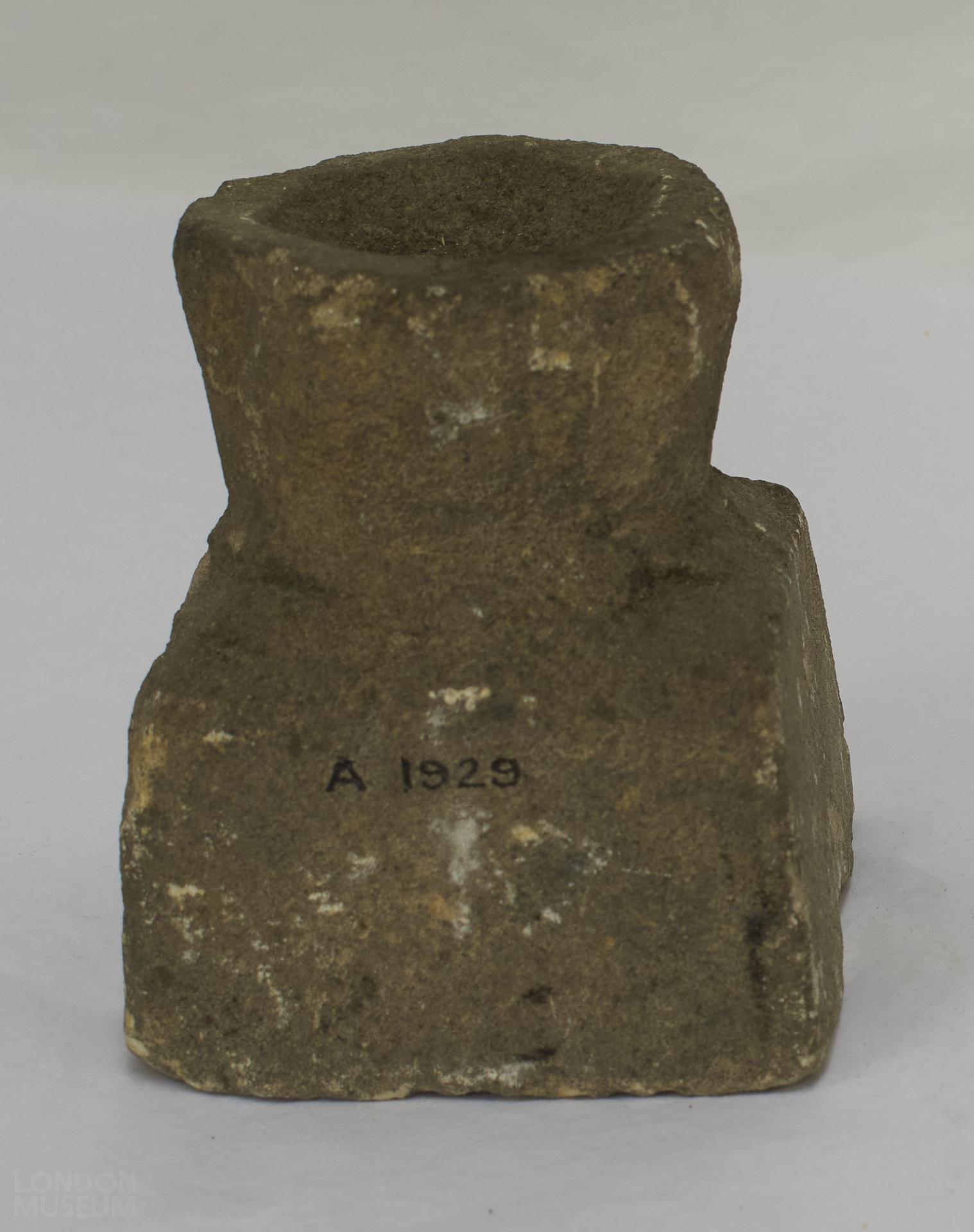 Oolitic limestone architectural fragment. A square base tapering slightly upwards towards a roughly hewn circular top with a shallow concavity.