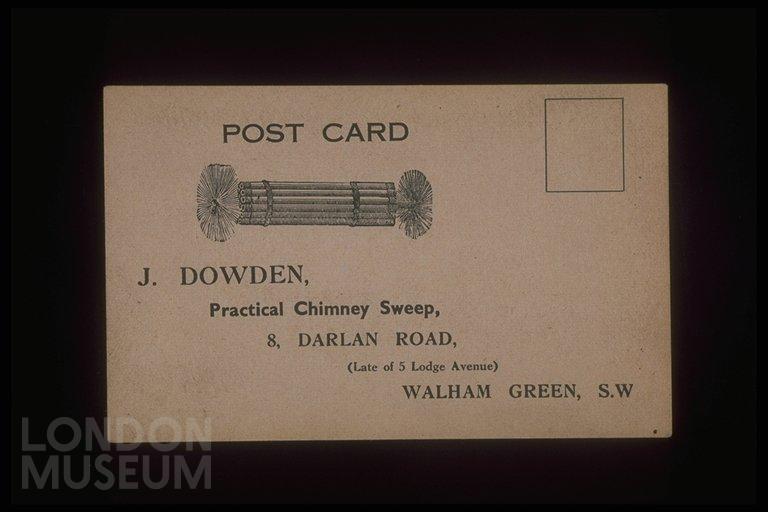 Post card with pre-printed address of J. Dowden, chimney sweep.