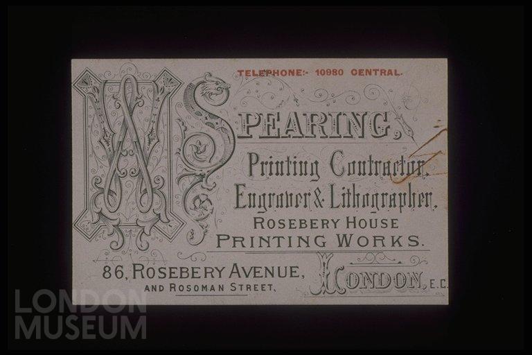 Illustrated trade card of Spearing, printer and engraver.