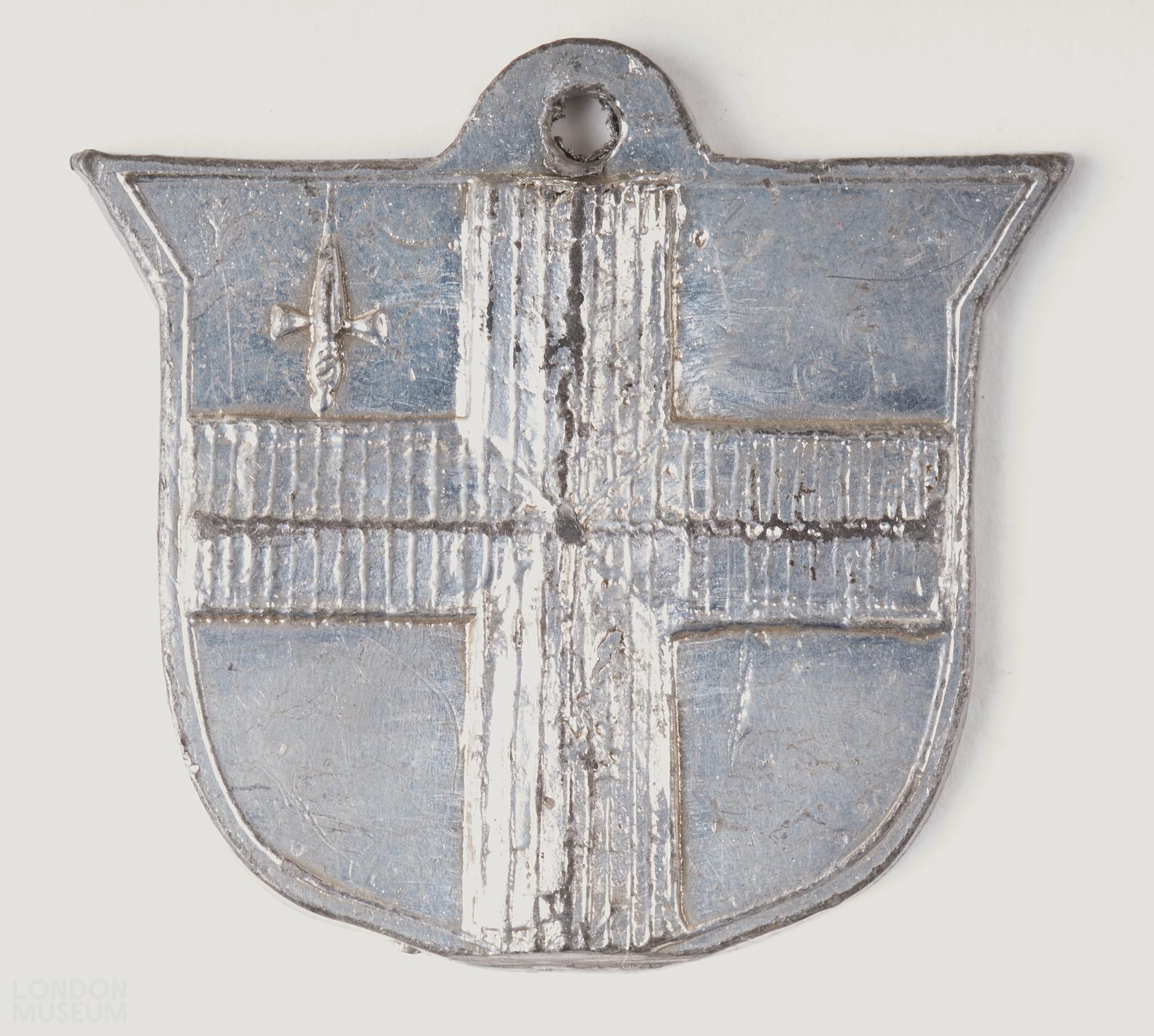 Ticket porter's badge, pewter, shield-shaped. One side City arms, other side plain.
