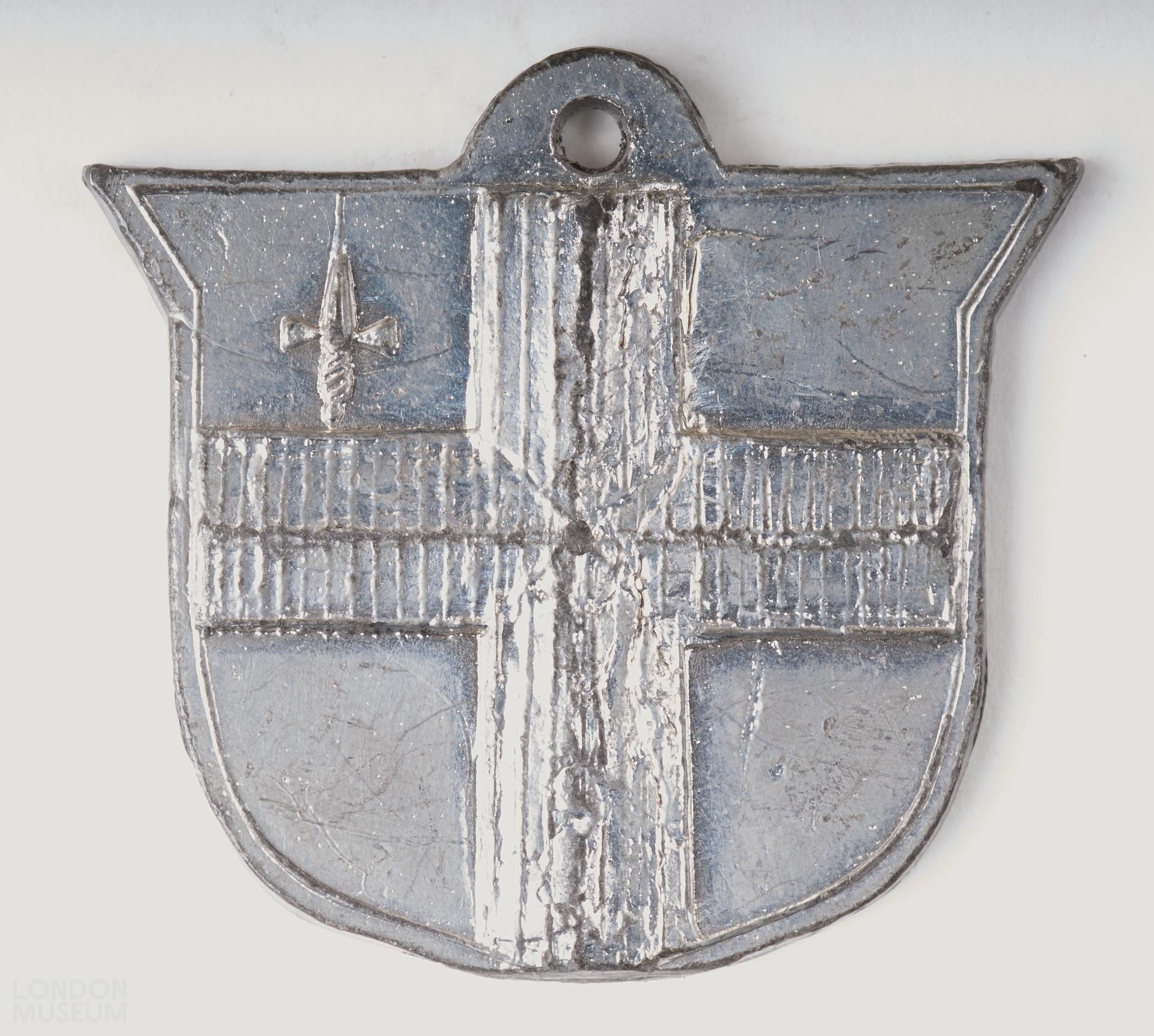 Ticket porter's badge, pewter, shield-shaped. One side City arms, other side plain