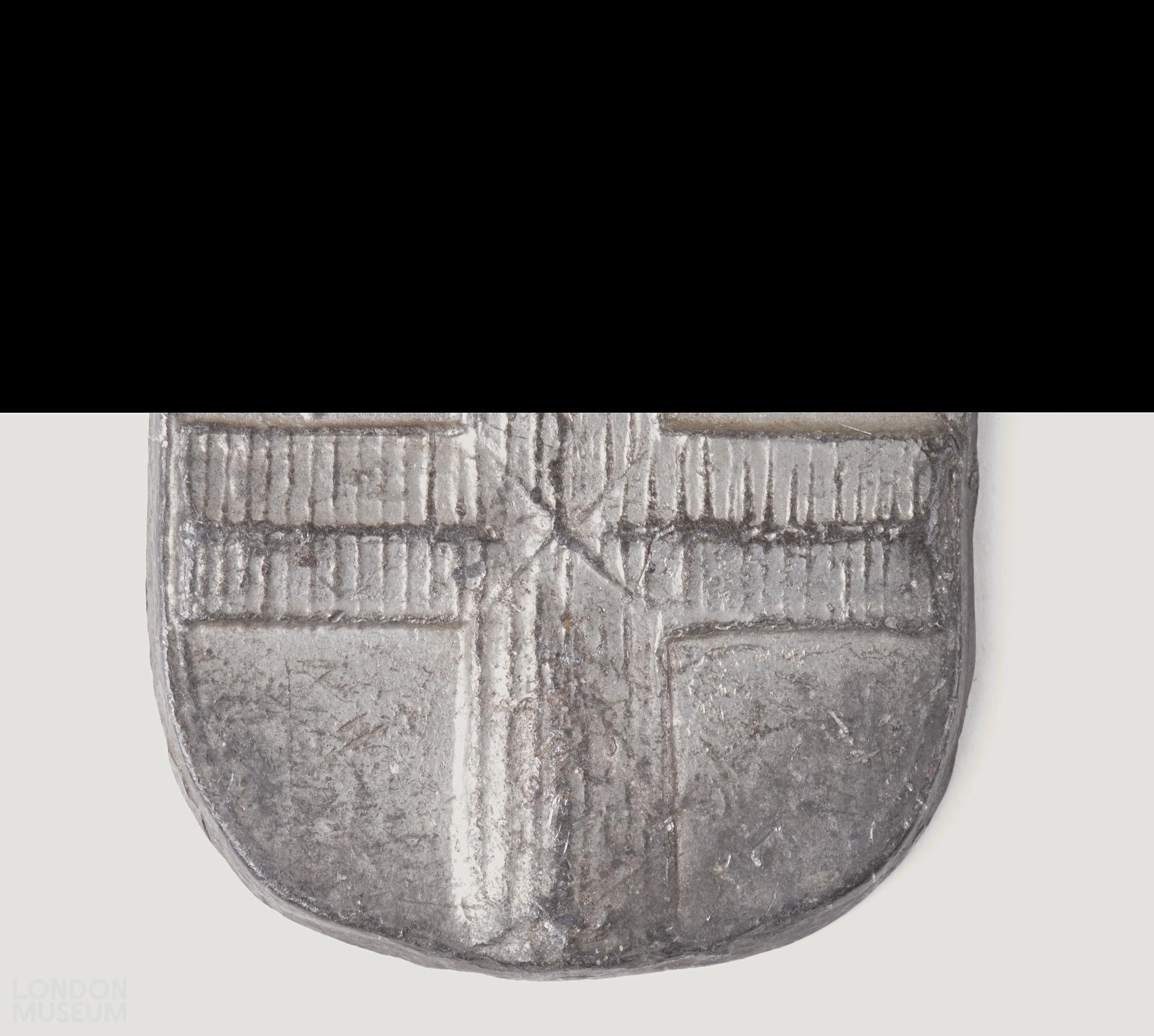 Ticket porter's badge, pewter, shield-shaped. One side City arms, other side plain