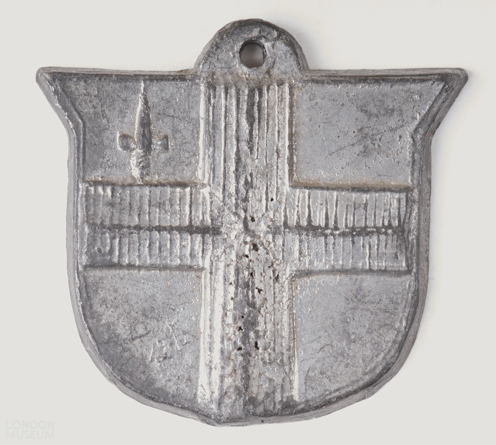Ticket porter's badge, pewter, shield-shaped. One side City arms, other side plain.