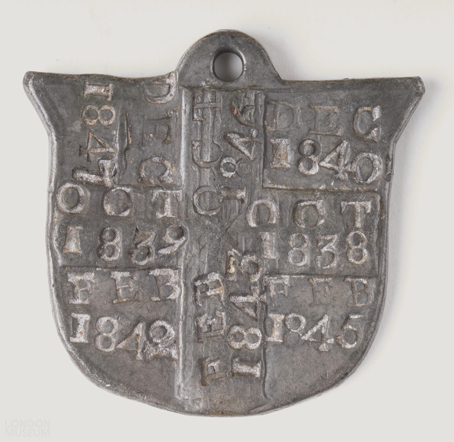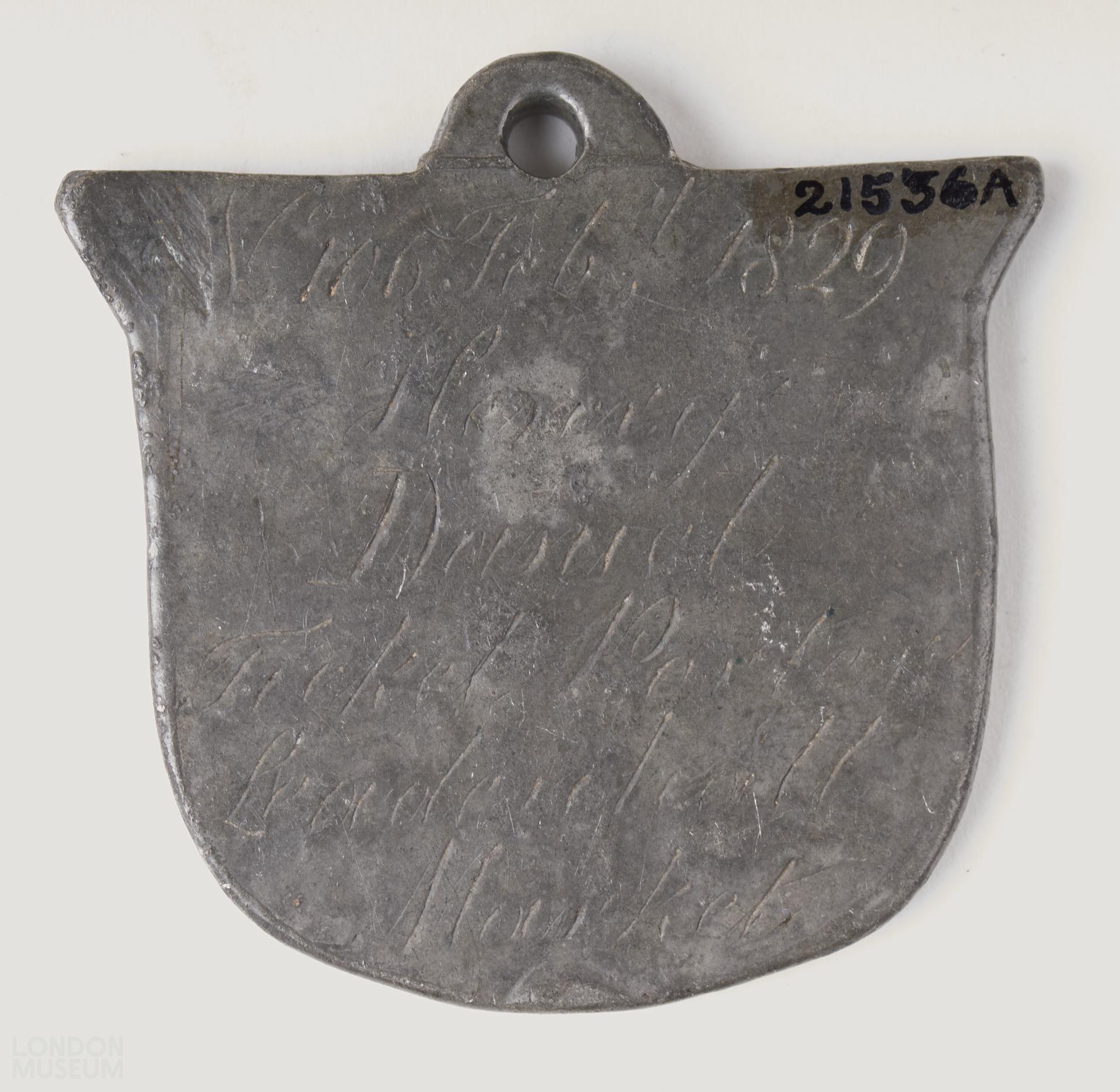Ticket porter's badge, pewter, shield-shaped. One side City arms, punched 'Oct 1838, Oct 1839, Dec 1840, Feb 1843, Feb 1844, Oct 1846, Feb 184?, Dec 184?', other side inscribed 'No 106 Feb 1829 Henry David Ticket Porter Leadenhall Market'.