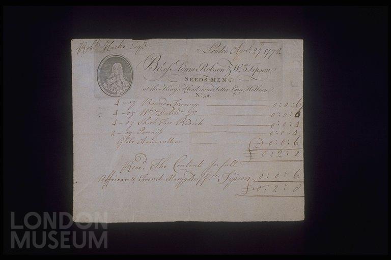 Illustrated invoice made out to Robt Hucks Esq. from Adam Robson and Wm Tipson, seedsmen.