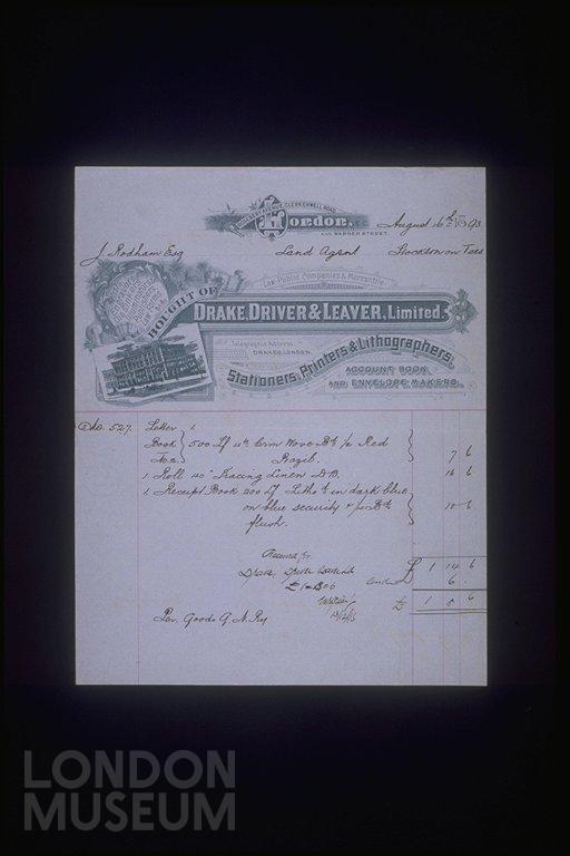 Illustrated invoice from Drake, Driver and Leaver, Limited, printers, to J. Rodham Esq.
