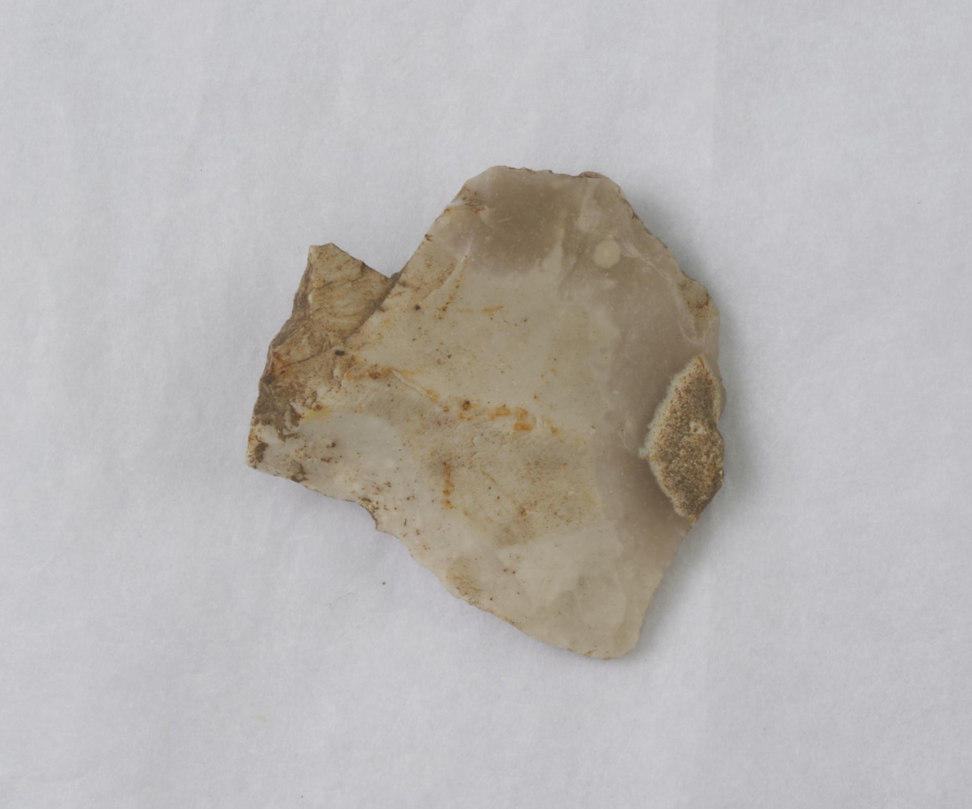 Snapped flint scraper. Partial cortex on the dorsal side. Roughly diamond in shape. Possibly a side scraper. One long edge has been retouched. Smooth on both sides.