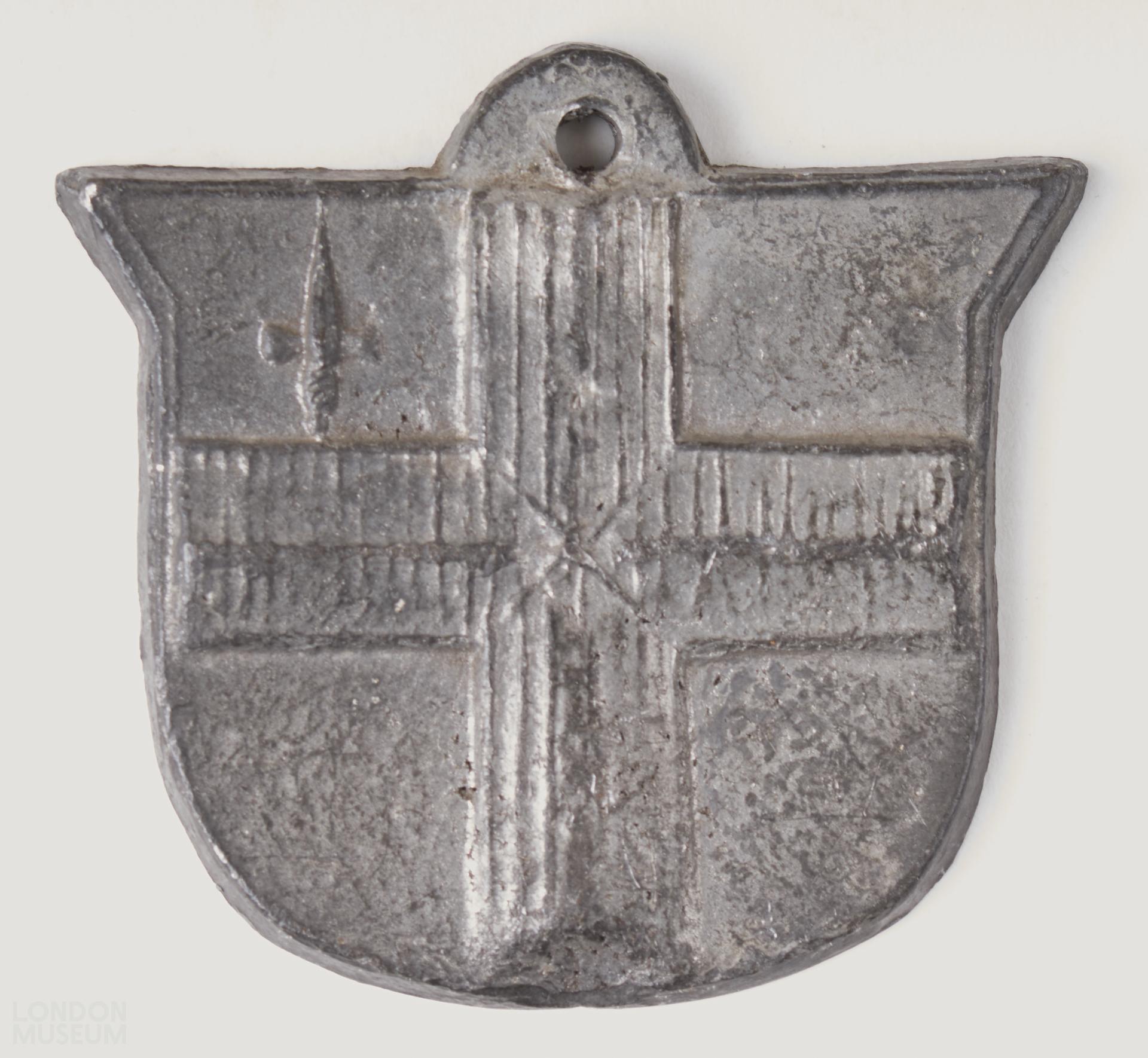 Ticket porter's badge, pewter, shield-shaped. One side City arms, other side plain.