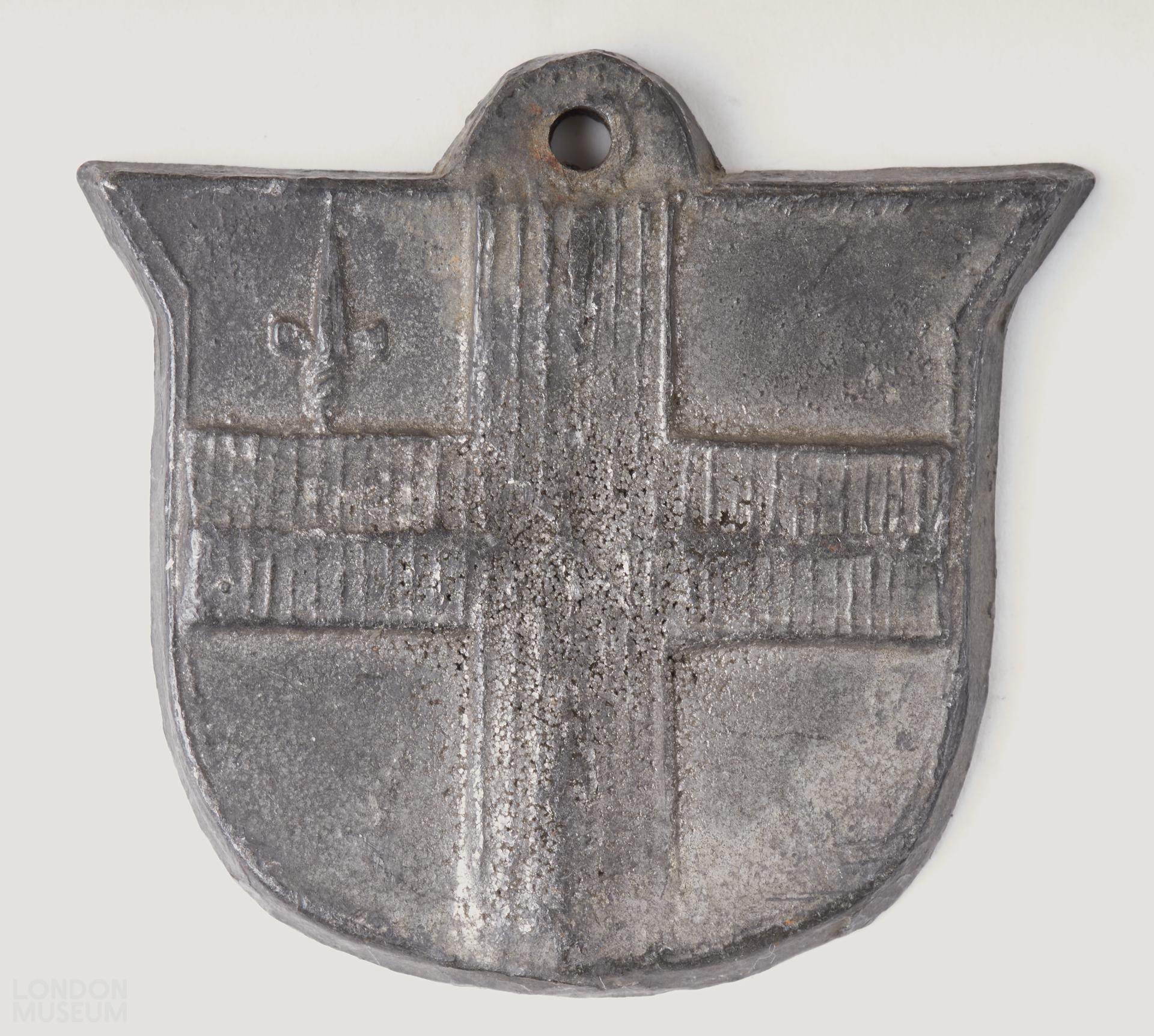 Ticket porter's badge, pewter, shield-shaped. One side City arms, other side plain.