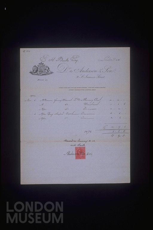 Illustrated, stamped invoice from Anderson and Son, tailors, to E.H. Banks Esq.