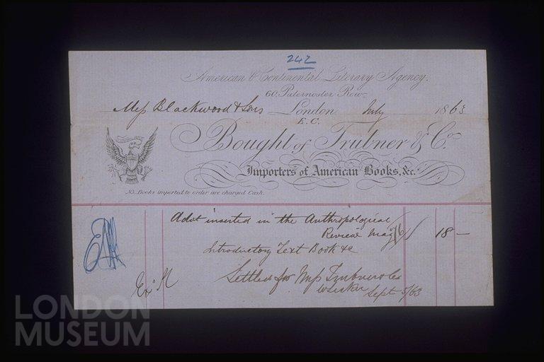 Illustrated invoice from Fruitner and Co, Importers of American Books, 60 Paternoster Row, publishers.