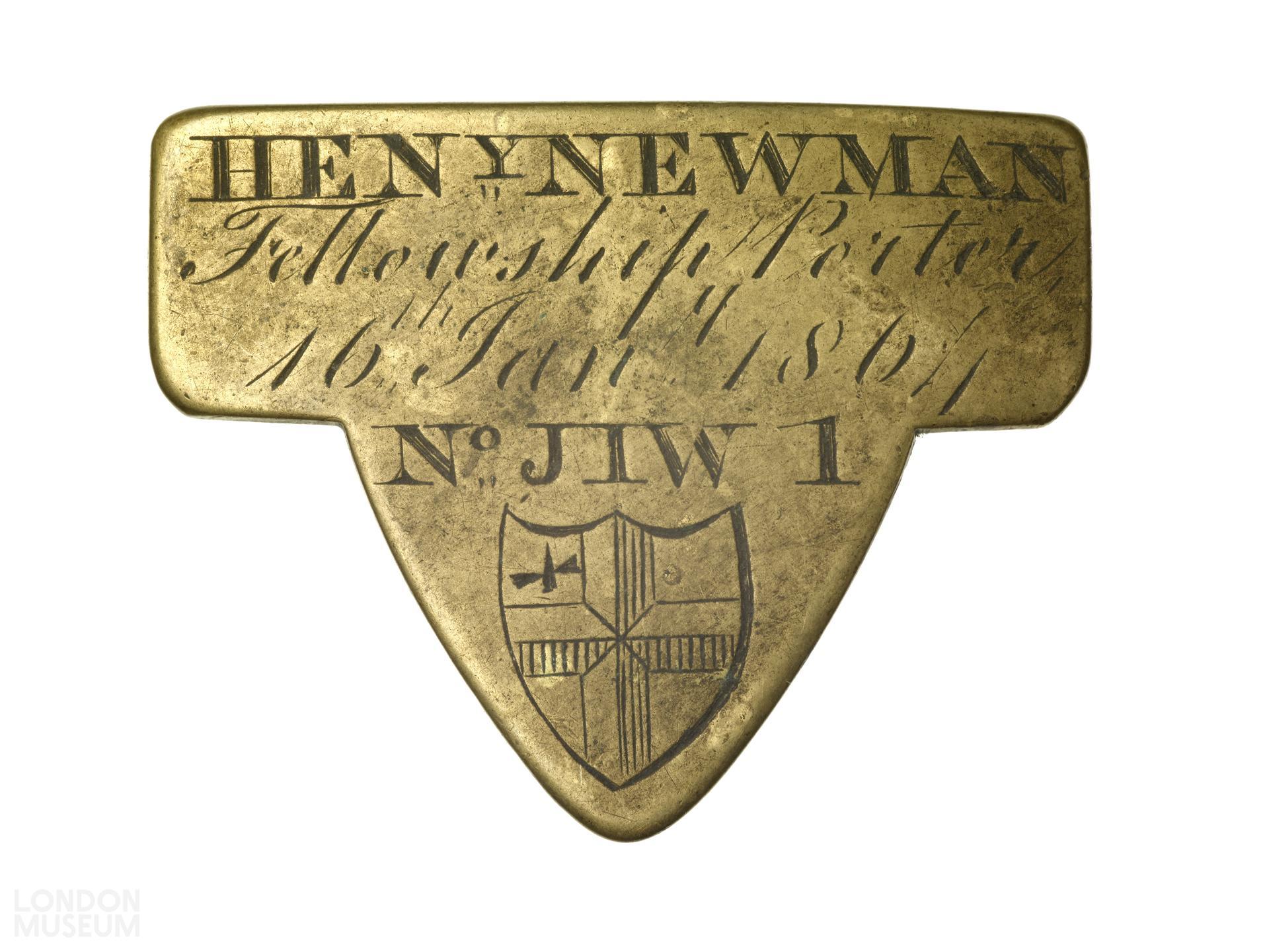 Brass Fellowship Porter's Badge inscribed, "Heny Newman/Fellowship Porter/16 Jan 1864/JIW No 1"