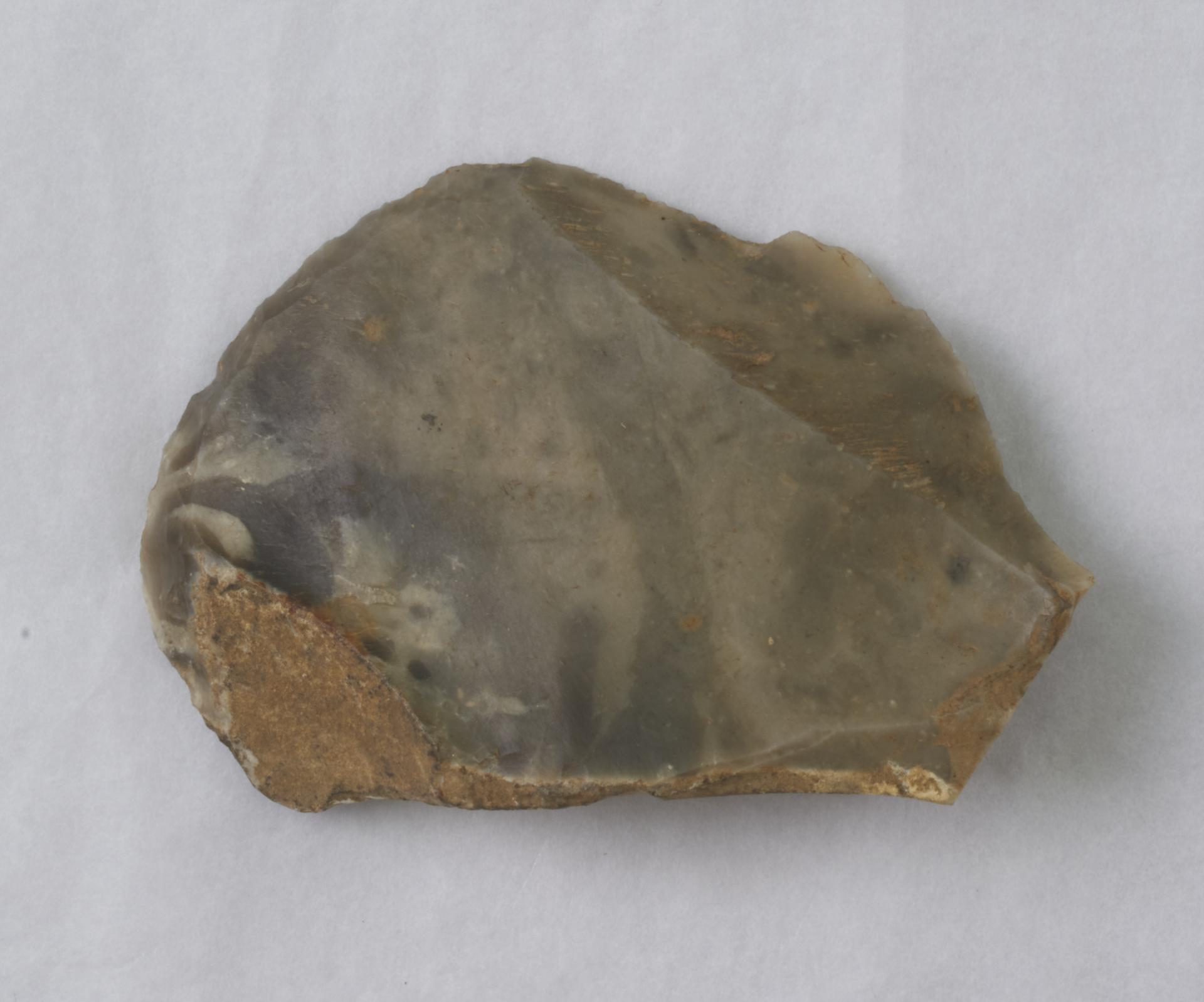 Irregular shaped scraper of greyish flint made on a large flake, with light retouch and inclusions on the curved edge.
