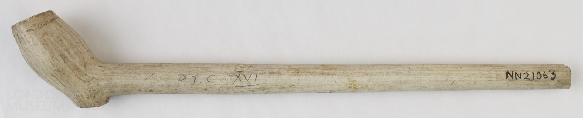 Incomplete clay pipe. Off white colour, mark near the rim of the bowl. Type AO10.