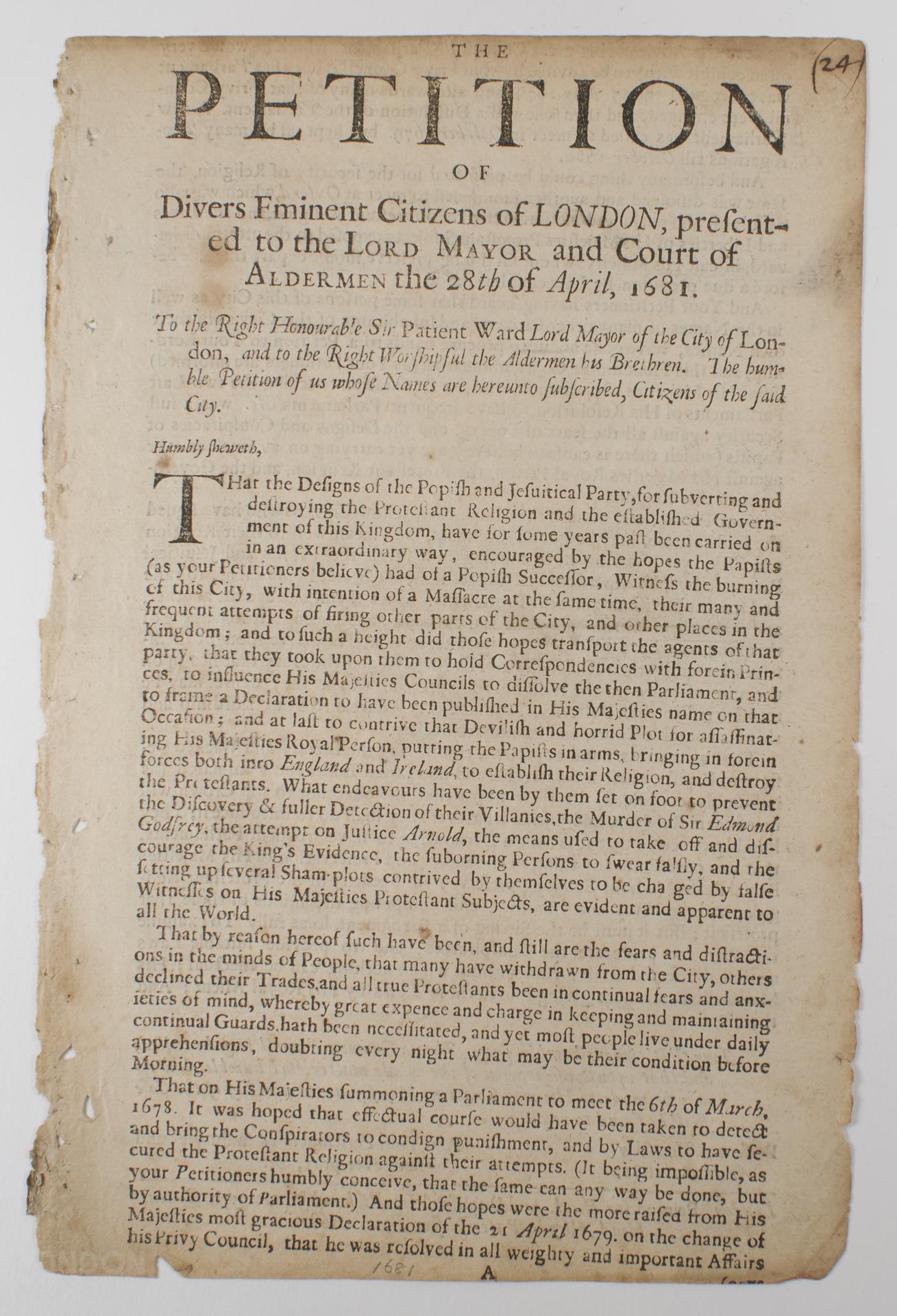 Double sided handbill petition entitled 'The Petition of Divers Eminent Citizens of London Presented to the Lord Mayor and Court of Aldermen the 28th of April 1681.' The petition requests that a Common Council be called by the Mayor & Aldermen with the intention of persuading the King to call a Parliament to defeat the 'Popish Conspirators'. Printed for 'B.A.' and published by Richard Janaway, in Queenshead Alley in Paternoster Row.
