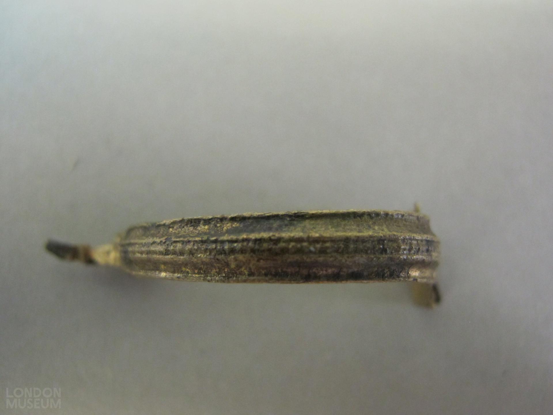 Copper alloy bow brooch with pin detached. Bow has tooled ridge running as far as the top of the catch plate which is solid; the name AVCISSA is stamped on the square shoulders at the head of the bow.